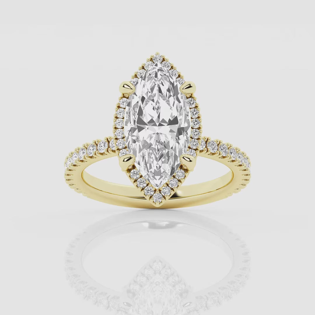 A striking marquise moissanite takes center stage, its elongated silhouette catching light with every movement. Encircled by a delicate halo, the design amplifies its brilliance, creating a soft yet captivating glow that feels both refined and radiant.