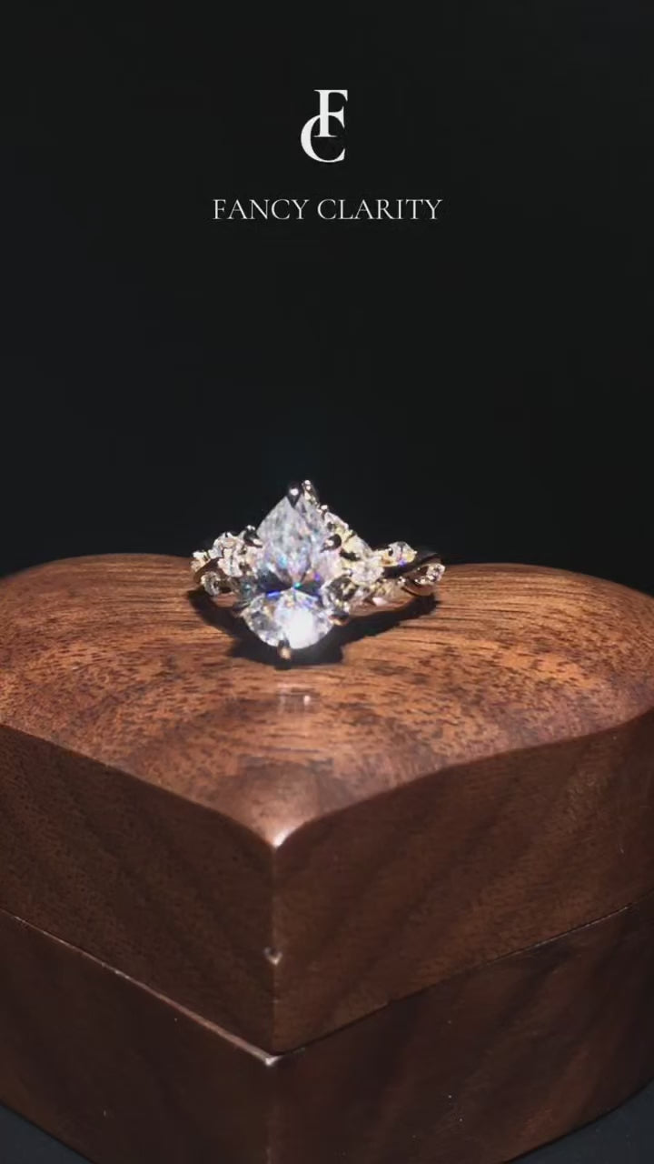 Romantic and nature-inspired, the Whispering Vines engagement ring features a luminous pear-cut Moissanite nestled in delicate claw prongs. Along the band, marquise-cut moissanite accents bloom like leaves on golden vines, wrapping gently around the finger in a graceful, organic flow.